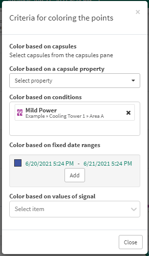 Data can be colored by time, by the values of a signal, or by condition. Condition coloring can be present with both time and signal, but time and signal are exclusive of each other. The priority of the different coloring options is: capsule selection, capsule property, condition, custom date ranges, signal, relative time. A particular point on the XY Plot will be colored by the first one of these options which applies to the point.