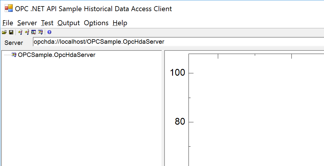 The OPC .NET API Sample Historical Data Access Client application will appear. In the Server textbox / dropdown at the top of the application, you must supply the address of the OPC HDA server.