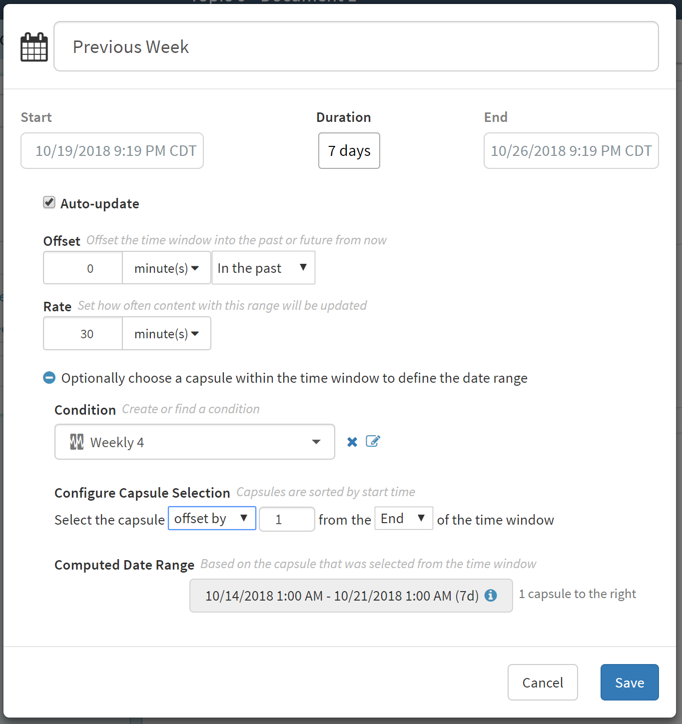 Condition-based ranges can be very useful in reports and dashboards. A few examples of when to use this range are to show the last startup, compare the last batch to the previous one, or to show the last 3 deviations.