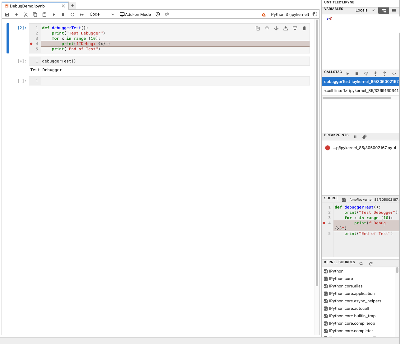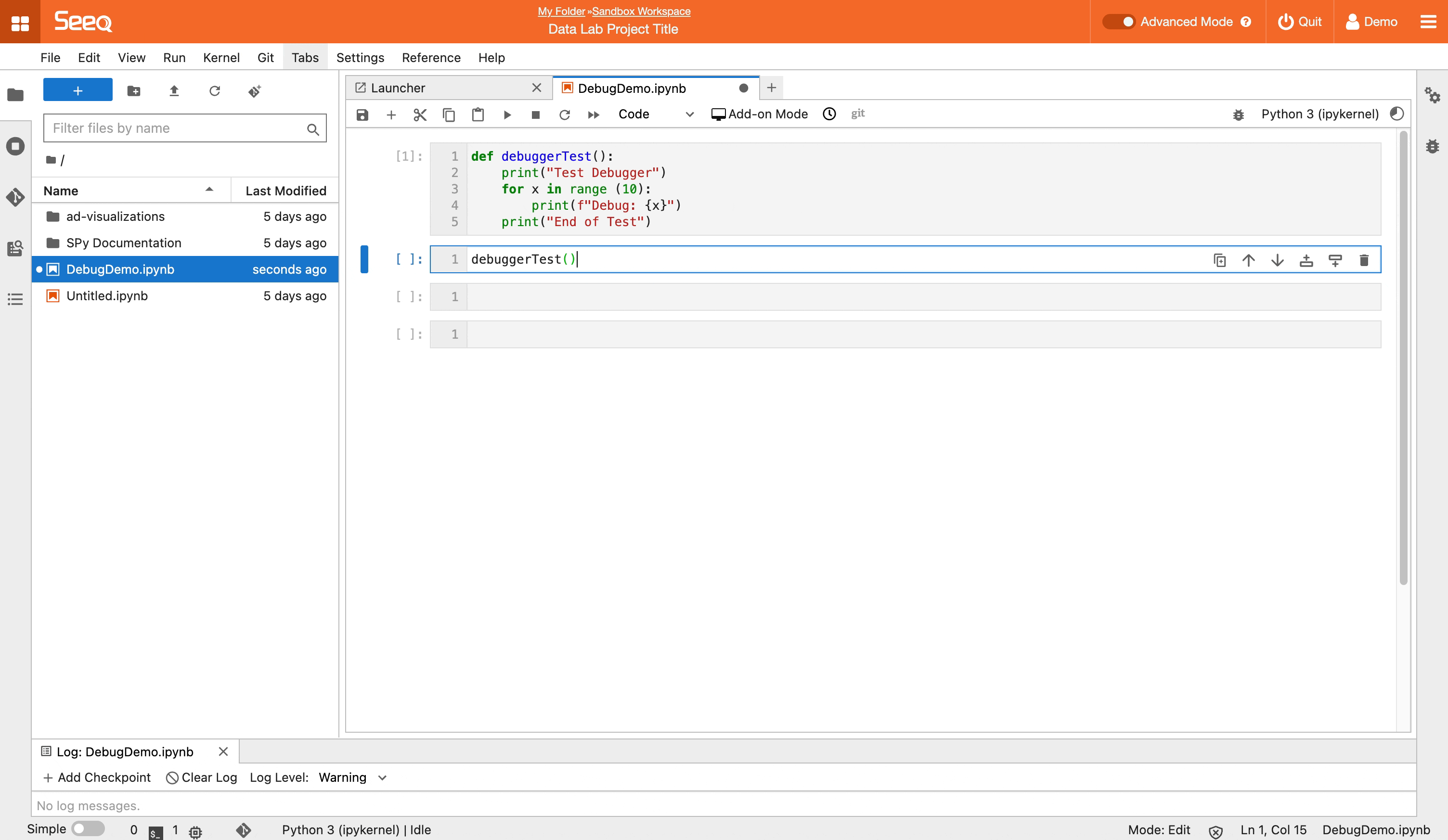 JupyterLab offers you the capability to debug your code right from a Data Lab project. To activate Debugging Mode click the “bug” icon in the top right corner of the notebook. You will then be able to add breakpoints to the notebook by clicking on the line number. The debug information will be located in the sidebar.