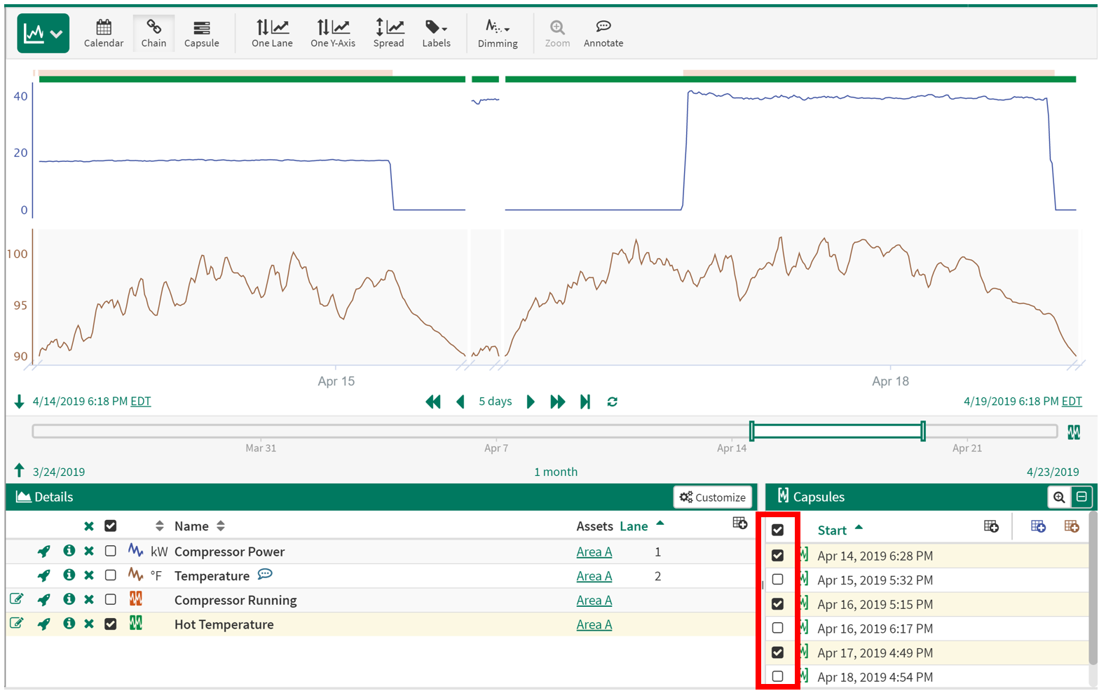 By selecting a condition in the details pane (check the box next to the item as shown in step 1 of the screenshot to the right), the capsules pane is filtered to just show capsules from the Hot Temperature condition (step 2). This filter also applies to the chain view plotting and now the trend only shows times when it is Hot Temperature.