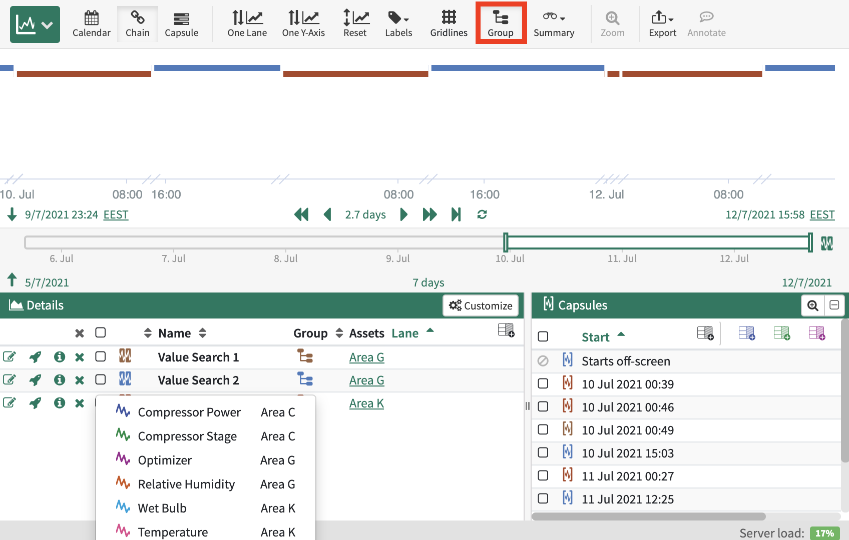 When the toolbar Group button is enabled, then any condition in the details pane that has no grouped signals will be automatically grouped with signals in the details pane that share the same parent asset. Additionally, any new signals or conditions that are added to the details pane will be automatically grouped if they share the same parent asset.