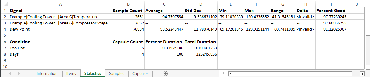 The Statistics sheet gives the general stats of the signals and conditions within the exported time range.