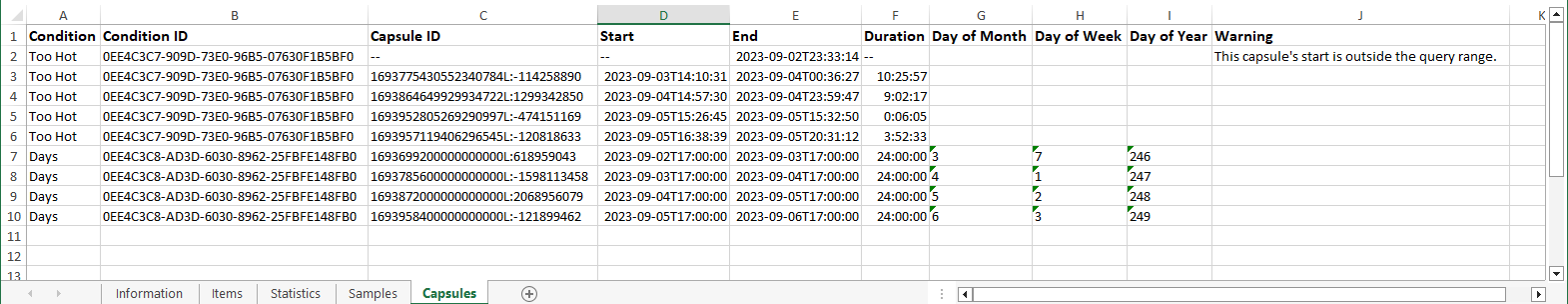 • Using the current start and end time, the Samples/Capsules sheet would contain more rows than Excel allows...