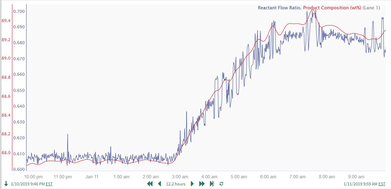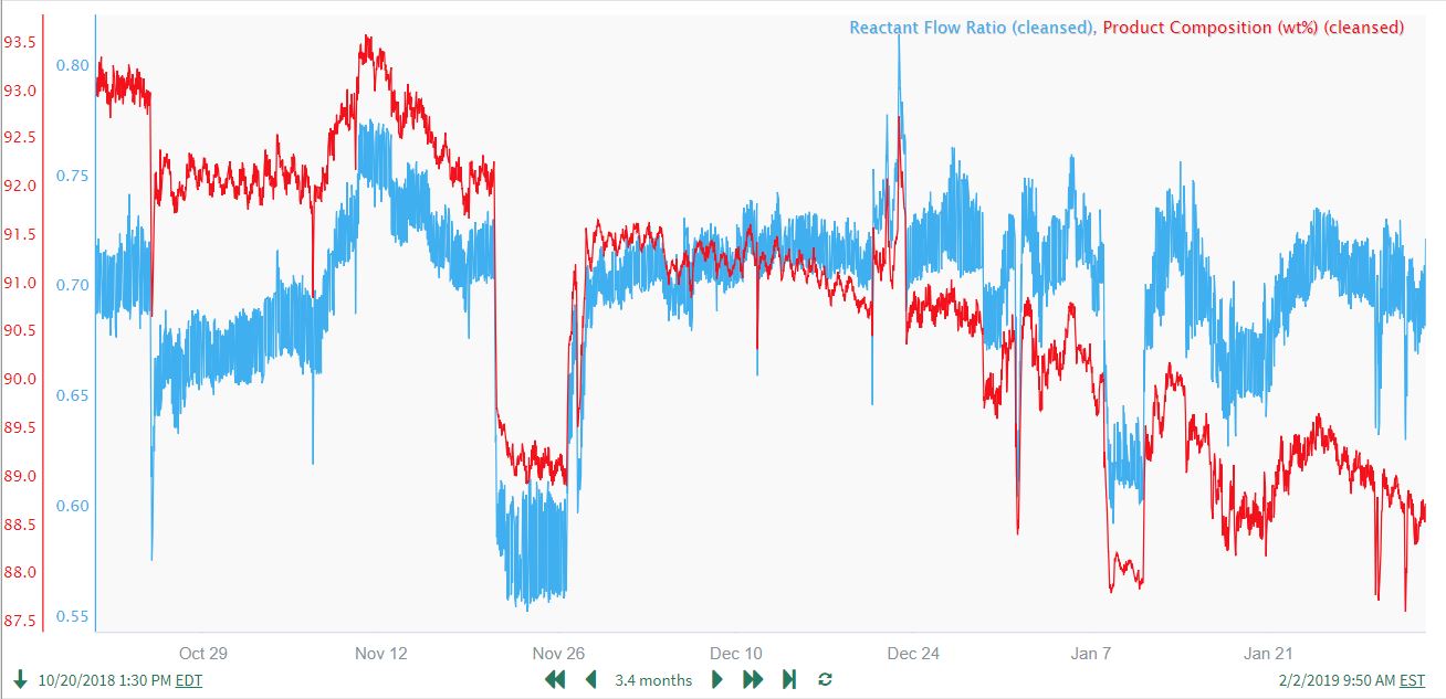 The unrelated downward drift in the product composition can be clearly seen when plotted in the same lane with the cleansed Reactant Flow ratio: