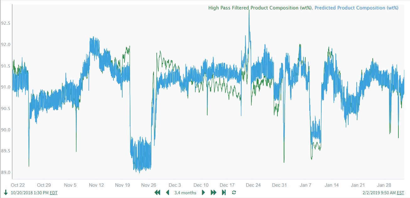 In this example application, a Product Composition is highly correlated with an upstream Reactant Flow Ratio, and we wish to quantify this relationship with a linear regression model. Prediction modeling with the raw data gives poor results because there is a long-term downward drift in the Product Composition due to catalyst deactivation. High pass filtering greatly improves modeling results, as it allows us to isolate the effects of Reactant Flow Ratio on Product Composition.