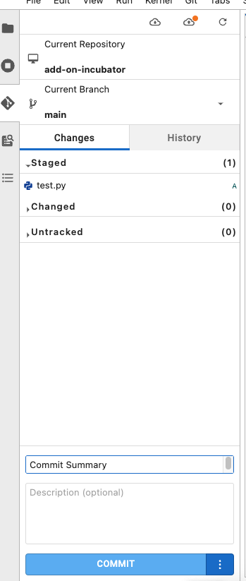 Enter a commit summary below while still in the Git tab (:git:), and optionally a description of the changes made. This is essentially like saving your work locally (saving everything staged so far).