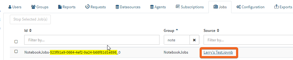 2. Navigate to the Admin UI, select Jobs, and filter for notebooks. The notebook ID is part of the job ID: