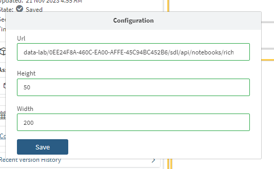 Configure the Height and Width of the window that the Data Lab content will display within. The height and width can either be specified as pixels with a number or they can be specified as a percentage. Specifying the height and width as a percentage allows the content to grow with the size to fill the available space as the browser screen size changes. For example, if height and width are set to 100% and the content is placed inside a table cell and that table is configured with a height of 100% the content will fill the whole browser window and will shrink or expand as it changes.