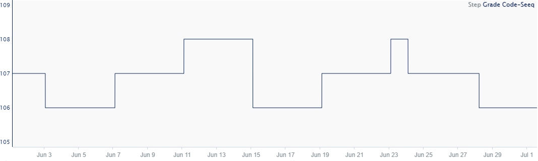 Data measuring a quantity that holds constant until a new sample is obtained. For instance, a unit produces either Product A or Product B. When production of Product A begins, the product code is set to Product A and holds steady until the process changes to Product B. When the process changes, there is an abrupt change from A to B. In this case, it may be most appropriate to view this transition as a step change to the new product. Note that every time value has a data value.