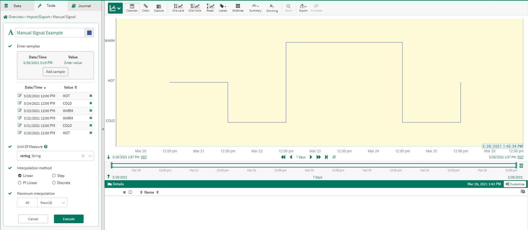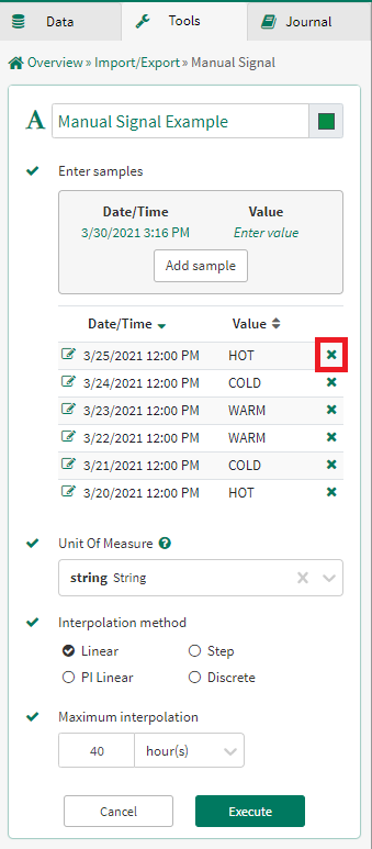 The Manual Signal tool can be used to create a signal manually by entering timestamp and value pairs.