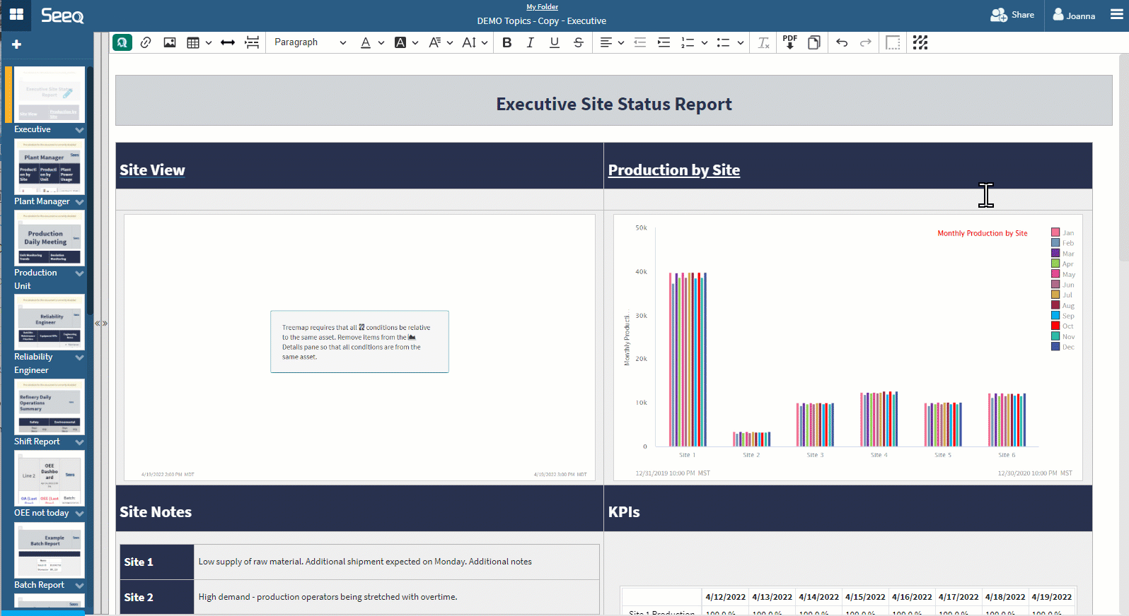 Organizer Topics can be used to generate reports and dashboards that can auto update. The Organizer Topic can be published to a PDF that contains live links back to View Only mode in Seeq, enabling any reader with appropriate permission to view the data.