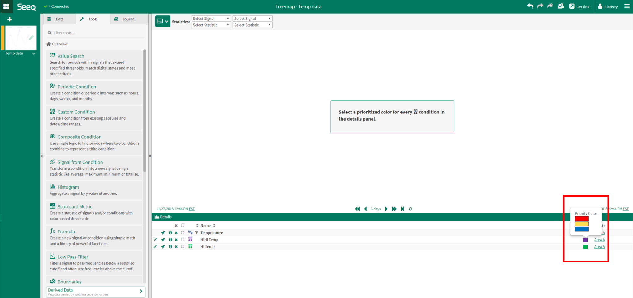 Note: The selected Temperature signal is part of an asset tree with the following structure: Example > Cooling Tower 1 > Area A > Temperature (shown in red box). The Hi Temp and HiHi Temp conditions were created based upon the value of this Temperature signal. When the Treemap is created, it will compare assets similar to Area A that also having a signal called Temperature.