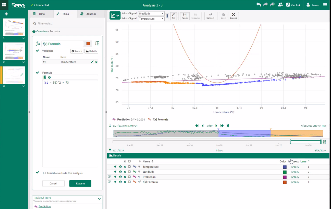 Any new single input Prediction created based on the x- and y-axis signals will automatically display after executed. The name and the r squared value are automatically displayed.