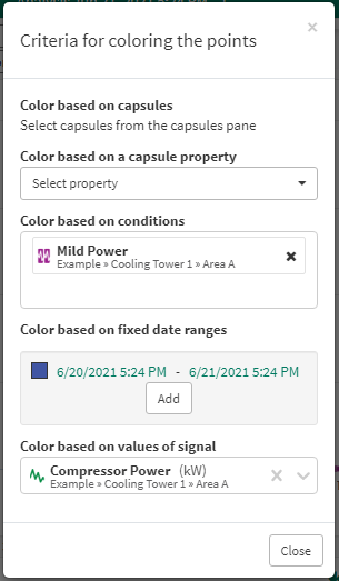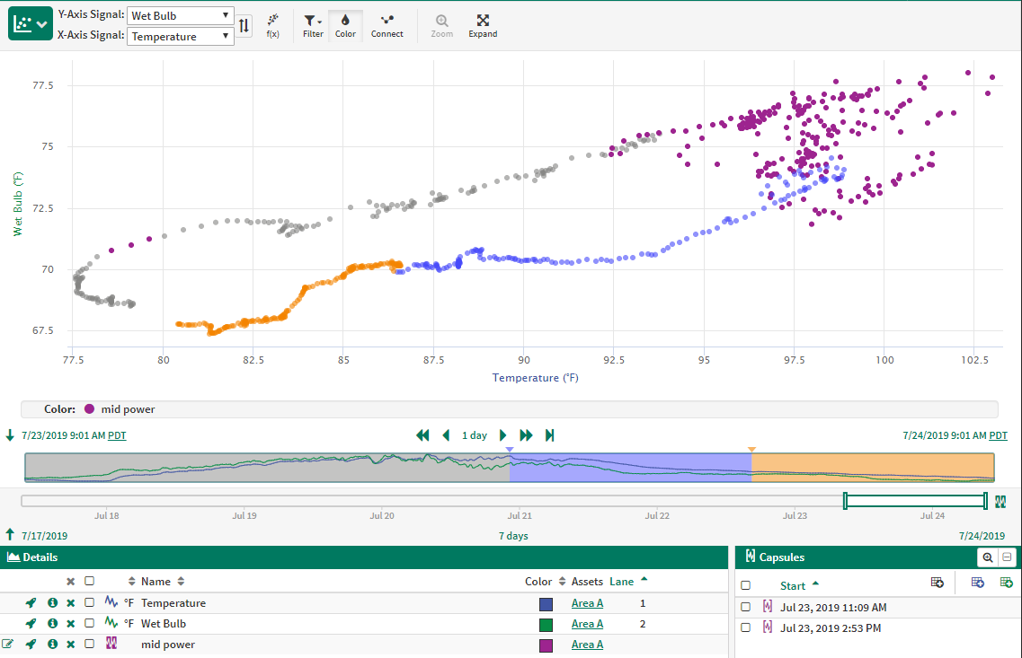 Data can be colored by time, by the values of a signal, or by condition. Condition coloring can be present with both time and signal, but time and signal are exclusive of each other. The priority of the different coloring options is: capsule selection, capsule property, condition, custom date ranges, signal, relative time. A particular point on the XY Plot will be colored by the first one of these options which applies to the point.