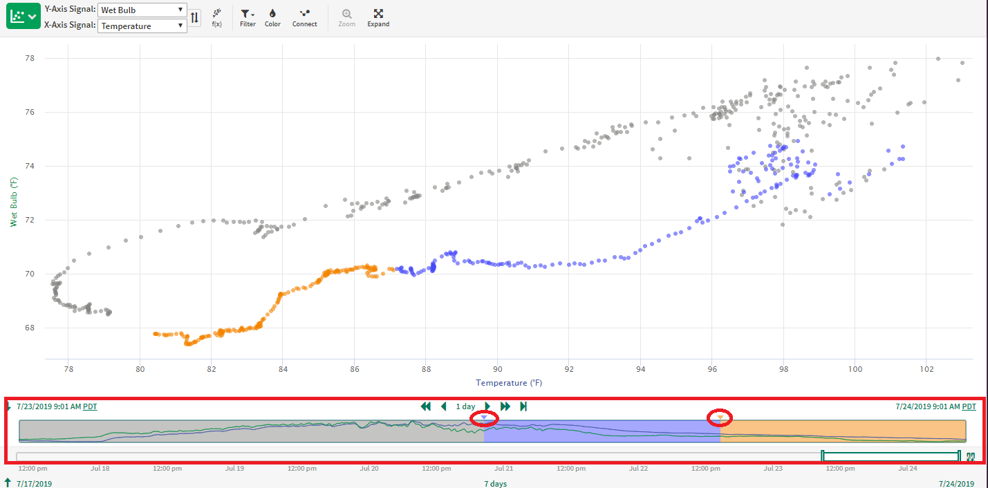 Coloring by relative time is the default when navigating to the XY Plot. The minimap below the XY Plot shows a simple trend of the two signals which are currently being plotted. Three colors can be used to show how the relationship between your signals is changing over time. The oldest data is grey (default 50% of display pane), followed by blue in the middle and the most recent 25% of data is shown in orange. To change the time range represented in each color bucket, drag the arrow between the colors as shown in the screenshot to the right.