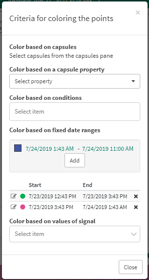 Points can be colored based on the values of a capsule property on any condition in the Details Pane. String-valued properties, as well as a capsule's start and end times, will be colored in rainbow colors. Numeric properties will be colored with a gradient similar to coloring by signal; the base color for this gradient can be changed in the color pop up. If a point on the plot is not within a capsule that has the selected capsule property, then it will be colored by a lower-priority coloring option (e.g. condition, signal, color range, relative time). If any conditions are selected in the Details Pane, then values of the capsule property for these conditions will be used for coloring the XY Plot points. If a point falls within multiple capsules, then the value used for coloring the point will be the capsule property value from the capsule with the earliest start time that has a valid value for the capsule property.